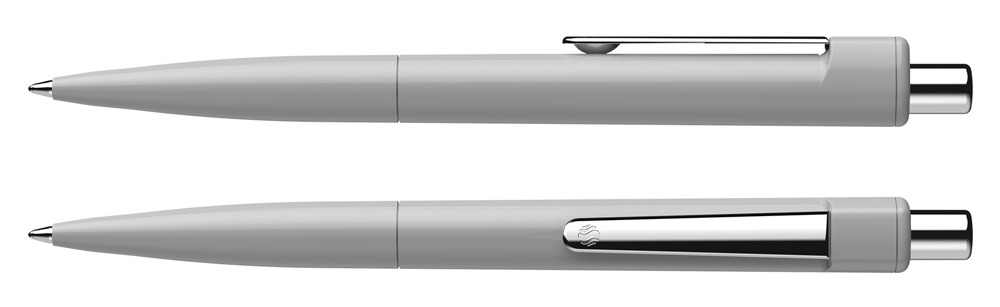 Klassischer Druckkugelschreiber aus opakem Kunststoff mit glänzender Oberfläche. Clip und Druckknopf aus Metall. Ausgestattet mit Schneider-Mine 774 M. Produkt mit finanziellem Klimabeitrag: Kompensation in Höhe der unvermeidbaren Emissionen in ein zertifiziertes Klimaschutzprojekt. Gehäuse: grau. Schreibfarbe: blau.