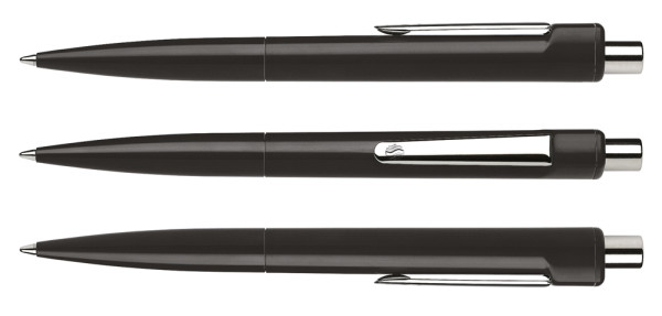 Klassischer Druckkugelschreiber aus opakem Kunststoff mit glänzender Oberfläche. Clip und Druckknopf aus Metall. Ausgestattet mit Schneider-Mine 774 M. Produkt mit finanziellem Klimabeitrag: Kompensation in Höhe der unvermeidbaren Emissionen in ein zertifiziertes Klimaschutzprojekt. Gehäuse: schwarz. Schreibfarbe: schwarz.