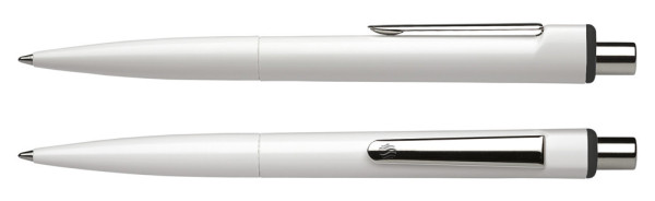Klassischer Druckkugelschreiber aus opakem Kunststoff mit glänzender Oberfläche. Clip und Druckknopf aus Metall. Ausgestattet mit Schneider-Mine 774 M. Produkt mit finanziellem Klimabeitrag: Kompensation in Höhe der unvermeidbaren Emissionen in ein zertifiziertes Klimaschutzprojekt. Gehäuse: weiß/schwarz. Schreibfarbe: schwarz.