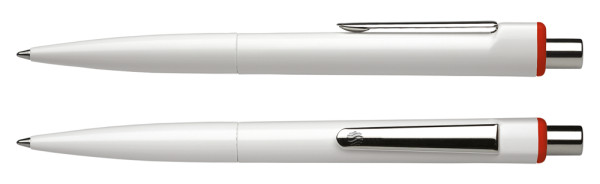 Klassischer Druckkugelschreiber aus opakem Kunststoff mit glänzender Oberfläche. Clip und Druckknopf aus Metall. Ausgestattet mit Schneider-Mine 774 M. Produkt mit finanziellem Klimabeitrag: Kompensation in Höhe der unvermeidbaren Emissionen in ein zertifiziertes Klimaschutzprojekt. Gehäuse: weiß/rot. Schreibfarbe: blau.