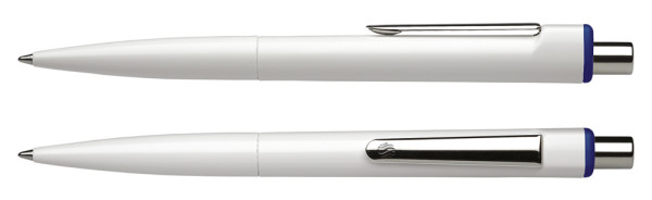 Klassischer Druckkugelschreiber aus opakem Kunststoff mit glänzender Oberfläche. Clip und Druckknopf aus Metall. Ausgestattet mit Schneider-Mine 774 M. Produkt mit finanziellem Klimabeitrag: Kompensation in Höhe der unvermeidbaren Emissionen in ein zertifiziertes Klimaschutzprojekt. Gehäuse: weiß/blau. Schreibfarbe: blau.
