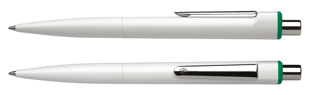 Klassischer Druckkugelschreiber aus opakem Kunststoff mit glänzender Oberfläche. Clip und Druckknopf aus Metall. Ausgestattet mit Schneider-Mine 774 M. Produkt mit finanziellem Klimabeitrag: Kompensation in Höhe der unvermeidbaren Emissionen in ein zertifiziertes Klimaschutzprojekt. Gehäuse: weiß/grün. Schreibfarbe: blau.