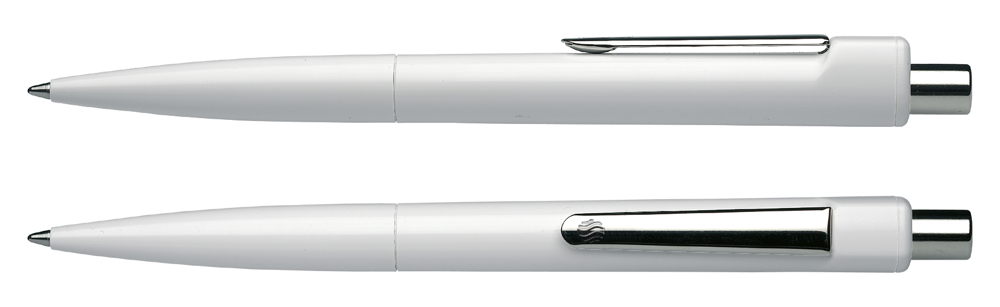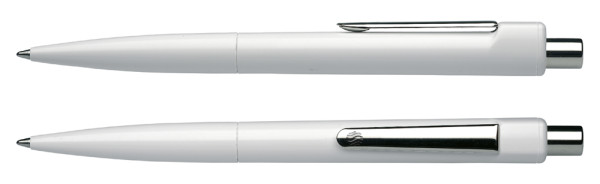 Klassischer Druckkugelschreiber aus opakem Kunststoff mit glänzender Oberfläche. Clip und Druckknopf aus Metall. Ausgestattet mit Schneider-Mine 774 M. Produkt mit finanziellem Klimabeitrag: Kompensation in Höhe der unvermeidbaren Emissionen in ein zertifiziertes Klimaschutzprojekt. Gehäuse: weiß. Schreibfarbe: blau.