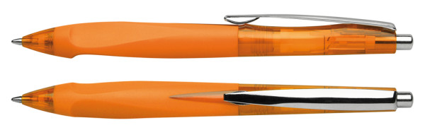 Druckkugelschreiber aus transparentem oder opakem Kunststoff, glänzender Oberfläche und einer rutschfest gummierten Dreikant-Griffzone. Clip und Druckknopf aus Metall. Ausgestattet mit Schneider-Mine 774 M. Produkt mit finanziellem Klimabeitrag: Kompensation in Höhe der unvermeidbaren Emissionen in ein zertifiziertes Klimaschutzprojekt. Gehäuse: orange-transparent. Schreibfarbe: blau.