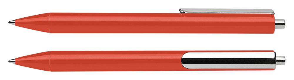 Druckkugelschreiber aus transparentem oder opakem Kunststoff mit glänzender Oberfläche. Clip und Druckknopf aus Metall. Ausgestattet mit Schneider-Mine 774 M. Produkt mit finanziellem Klimabeitrag: Kompensation in Höhe der unvermeidbaren Emissionen in ein zertifiziertes Klimaschutzprojekt. Gehäuse: rot. Schreibfarbe: blau.