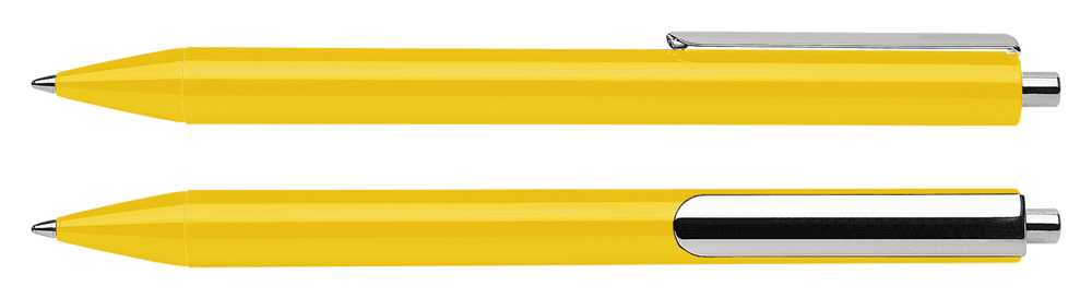 Druckkugelschreiber aus transparentem oder opakem Kunststoff mit glänzender Oberfläche. Clip und Druckknopf aus Metall. Ausgestattet mit Schneider-Mine 774 M. Produkt mit finanziellem Klimabeitrag: Kompensation in Höhe der unvermeidbaren Emissionen in ein zertifiziertes Klimaschutzprojekt. Gehäuse: gelb. Schreibfarbe: blau.
