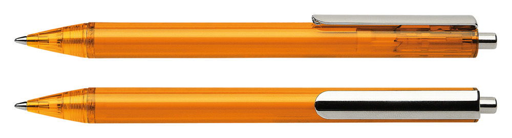 Druckkugelschreiber aus transparentem oder opakem Kunststoff mit glänzender Oberfläche. Clip und Druckknopf aus Metall. Ausgestattet mit Schneider-Mine 774 M. Produkt mit finanziellem Klimabeitrag: Kompensation in Höhe der unvermeidbaren Emissionen in ein zertifiziertes Klimaschutzprojekt. Gehäuse: orange-transparent. Schreibfarbe: blau.