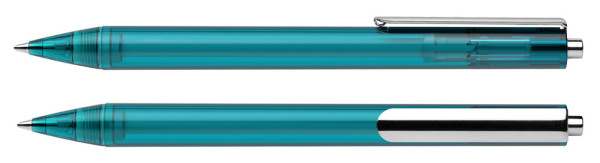 Druckkugelschreiber aus transparentem oder opakem Kunststoff mit glänzender Oberfläche. Clip und Druckknopf aus Metall. Ausgestattet mit Schneider-Mine 774 M. Produkt mit finanziellem Klimabeitrag: Kompensation in Höhe der unvermeidbaren Emissionen in ein zertifiziertes Klimaschutzprojekt. Gehäuse: türkis-transparent. Schreibfarbe: blau.