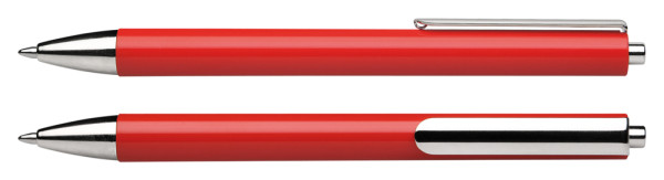 Druckkugelschreiber aus transparentem oder opakem Kunststoff mit glänzender Oberfläche. Gehäusespitze, Clip und Druckknopf aus Metall. Ausgestattet mit Schneider-Mine 774 M. Produkt mit finanziellem Klimabeitrag: Kompensation in Höhe der unvermeidbaren Emissionen in ein zertifiziertes Klimaschutzprojekt. Gehäuse: rot. Schreibfarbe: blau.