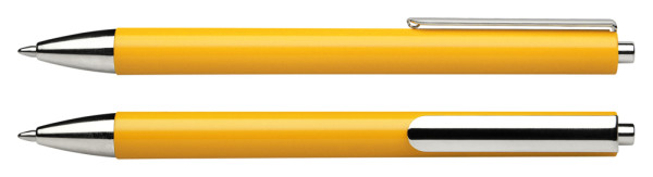 Druckkugelschreiber aus transparentem oder opakem Kunststoff mit glänzender Oberfläche. Gehäusespitze, Clip und Druckknopf aus Metall. Ausgestattet mit Schneider-Mine 774 M. Produkt mit finanziellem Klimabeitrag: Kompensation in Höhe der unvermeidbaren Emissionen in ein zertifiziertes Klimaschutzprojekt. Gehäuse: gelb. Schreibfarbe: blau.