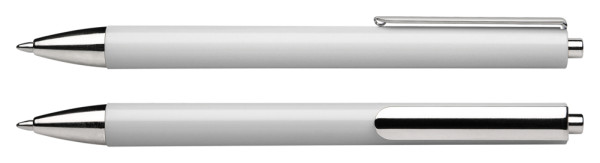 Druckkugelschreiber aus transparentem oder opakem Kunststoff mit glänzender Oberfläche. Gehäusespitze, Clip und Druckknopf aus Metall. Ausgestattet mit Schneider-Mine 774 M. Produkt mit finanziellem Klimabeitrag: Kompensation in Höhe der unvermeidbaren Emissionen in ein zertifiziertes Klimaschutzprojekt. Gehäuse: weiß. Schreibfarbe: blau.