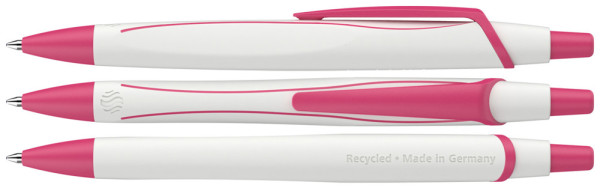 Erster Kugelschreiber, der mit dem weltweit bekanntesten Umweltzeichen "Blauer Engel" ausgezeichnet ist. Dynamisches Design mit elegant matt schimmernder Oberfläche. Variante „Line“ mit farbiger Designlinie. Umwelt- und ressourcenschonend mit einem *Gehäuse aus 92 % recyceltem Kunststoff hergestellt. Auswechselbare Großraummine Eco 725 M mit einem Gehäuse aus 95 % recyceltem Kunststoff. Produkt mit finanziellem Klimabeitrag: Kompensation in Höhe der unvermeidbaren Emissionen in ein zertifiziertes Klimaschutzprojekt. Gehäuse: weiß/pink. Schreibfarbe: blau.