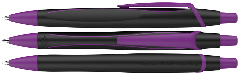 Erster Kugelschreiber, der mit dem weltweit bekanntesten Umweltzeichen "Blauer Engel" ausgezeichnet ist. Dynamisches Design mit elegant matt schimmernder Oberfläche. Variante „Line“ mit farbiger Designlinie. Umwelt- und ressourcenschonend mit einem *Gehäuse aus 92 % recyceltem Kunststoff hergestellt. Auswechselbare Großraummine Eco 725 M mit einem Gehäuse aus 95 % recyceltem Kunststoff. Produkt mit finanziellem Klimabeitrag: Kompensation in Höhe der unvermeidbaren Emissionen in ein zertifiziertes Klimaschutzprojekt. Gehäuse: schwarz/lila. Schreibfarbe: blau.