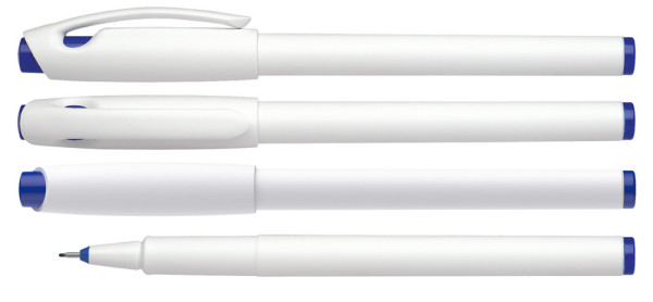 Fineliner aus opakem Kunststoff mit fein mattierter Oberfläche. *Gehäuse zu 82 % aus Recycling-Kunststoff. Cap off-Tinte, kann 2–3 Tage offen liegen. Metallgefasste Faserspitze 0,4 mm. Produkt mit finanziellem Klimabeitrag: Kompensation in Höhe der unvermeidbaren Emissionen in ein zertifiziertes Klimaschutzprojekt. Gehäuse: weiß/blau. Schreibfarbe: blau.