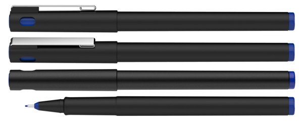 Fineliner aus opakem Kunststoff mit fein mattierter Oberfläche. *Gehäuse zu 82 % aus Recycling-Kunststoff. Cap off-Tinte, kann 2–3 Tage offen liegen. Metallclip und metallgefasste Faserspitze 0,4 mm. Produkt mit finanziellem Klimabeitrag: Kompensation in Höhe der unvermeidbaren Emissionen in ein zertifiziertes Klimaschutzprojekt. Gehäuse: schwarz/blau. Schreibfarbe: blau.