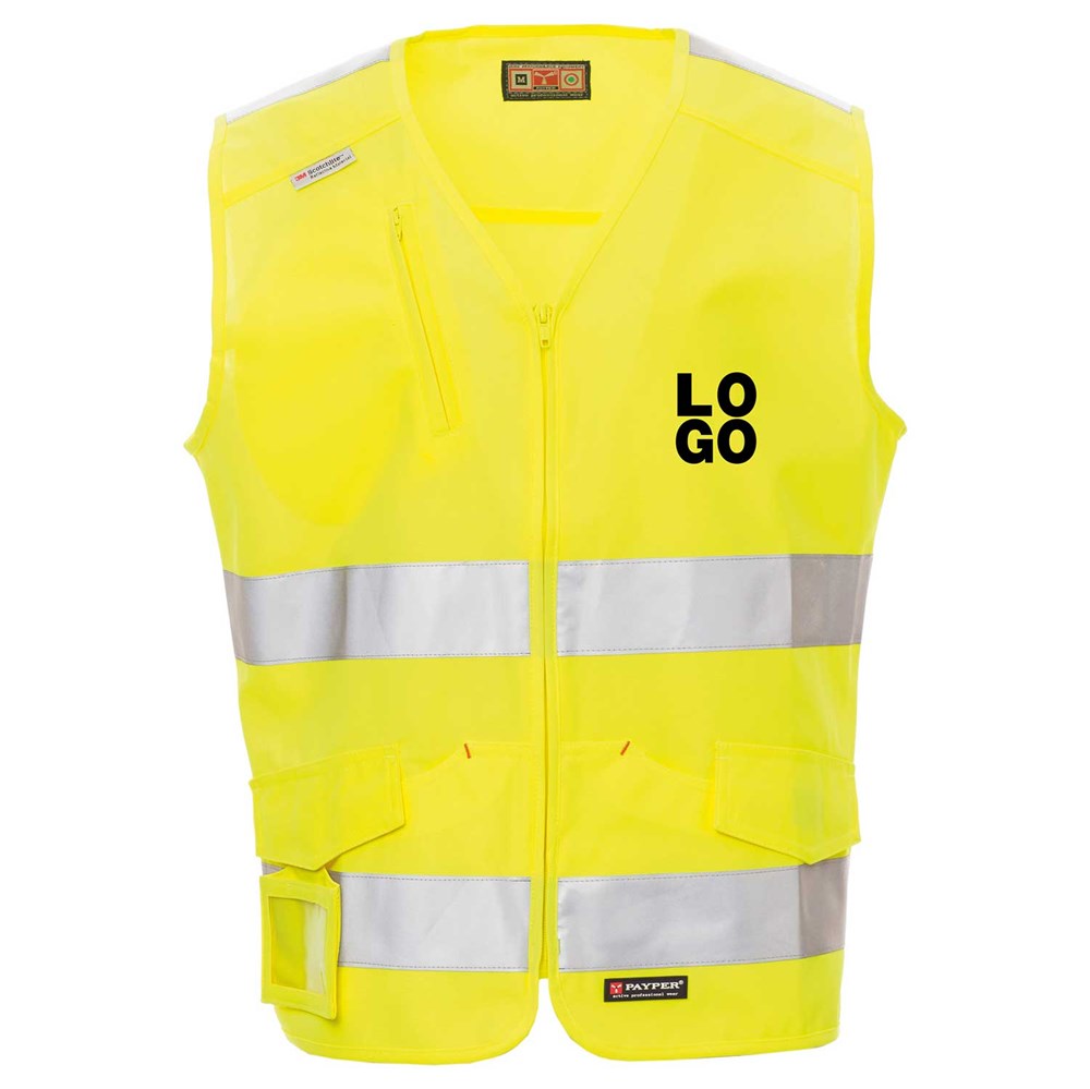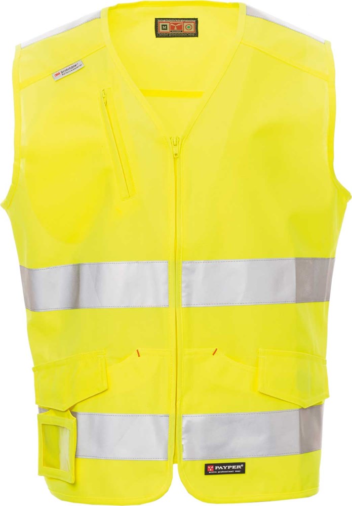 Warnweste aus 100% Polyester und 3M-Scotchlite-Streifen. Diese Weste besticht durch viel Extras wie: Reißverschluss, zwei Vordertaschen mit LOCK SYSTEM im Kängaruschnitt, abtrennbarem und verschließbaren Ausweisfach und einer Brusttasche mit Reißverschluss.