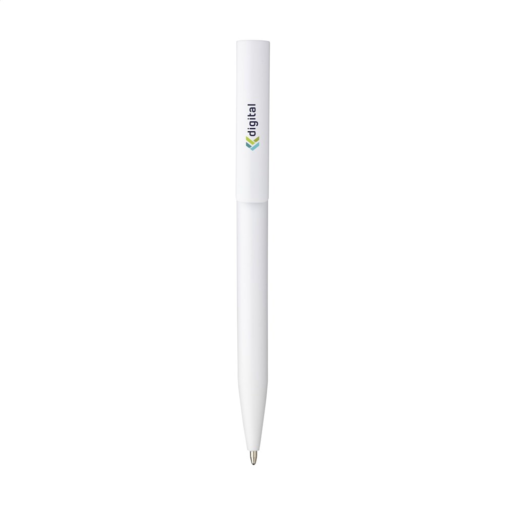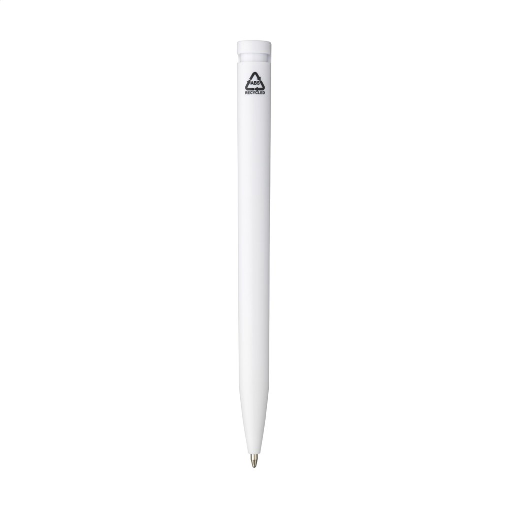 Blauschreibender Kugelschreiber mit einem Gehäuse aus 100% recyceltem ABS. Der Clip/Druckknopf ist mit einem auffälligen farblichen Akzent gestaltet und bietet Platz für einen großzügigen, digitalen Vollfarbaufdruck. GRS-zertifiziert.