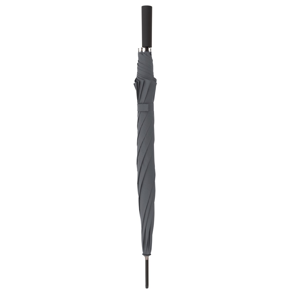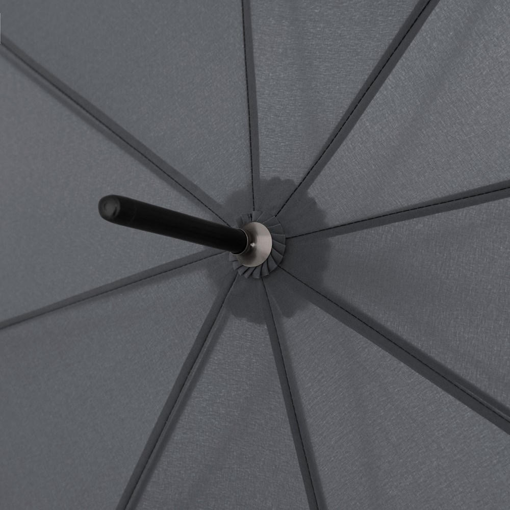 Der Langschirm mit Automatikfunktion besticht durch sein schwarzes Gestell und Fieberglasschienen welche ihn zu einem sehr robusten und windstabilen Begleiter machen. Sein modischer Stabgriff liegt gut in der Hand und bietet Kunden die Möglichkeit, ein individuell gestaltetes 3D-Sticker auf der Griffunterseite anzubringen.