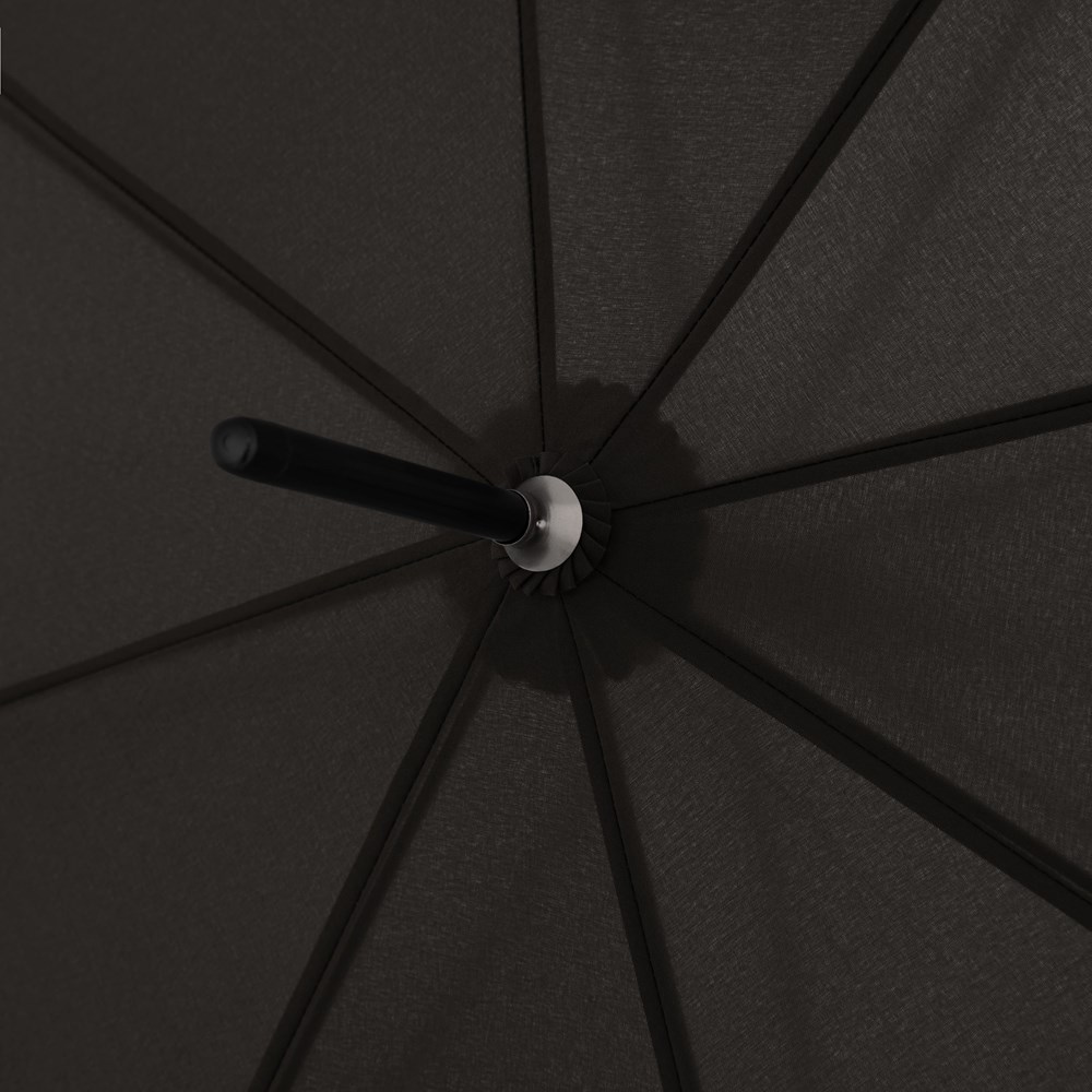 Der Langschirm mit Automatikfunktion besticht durch sein schwarzes Gestell und Fieberglasschienen welche ihn zu einem sehr robusten und windstabilen Begleiter machen. Sein modischer Stabgriff liegt gut in der Hand und bietet Kunden die Möglichkeit, ein individuell gestaltetes 3D-Sticker auf der Griffunterseite anzubringen.