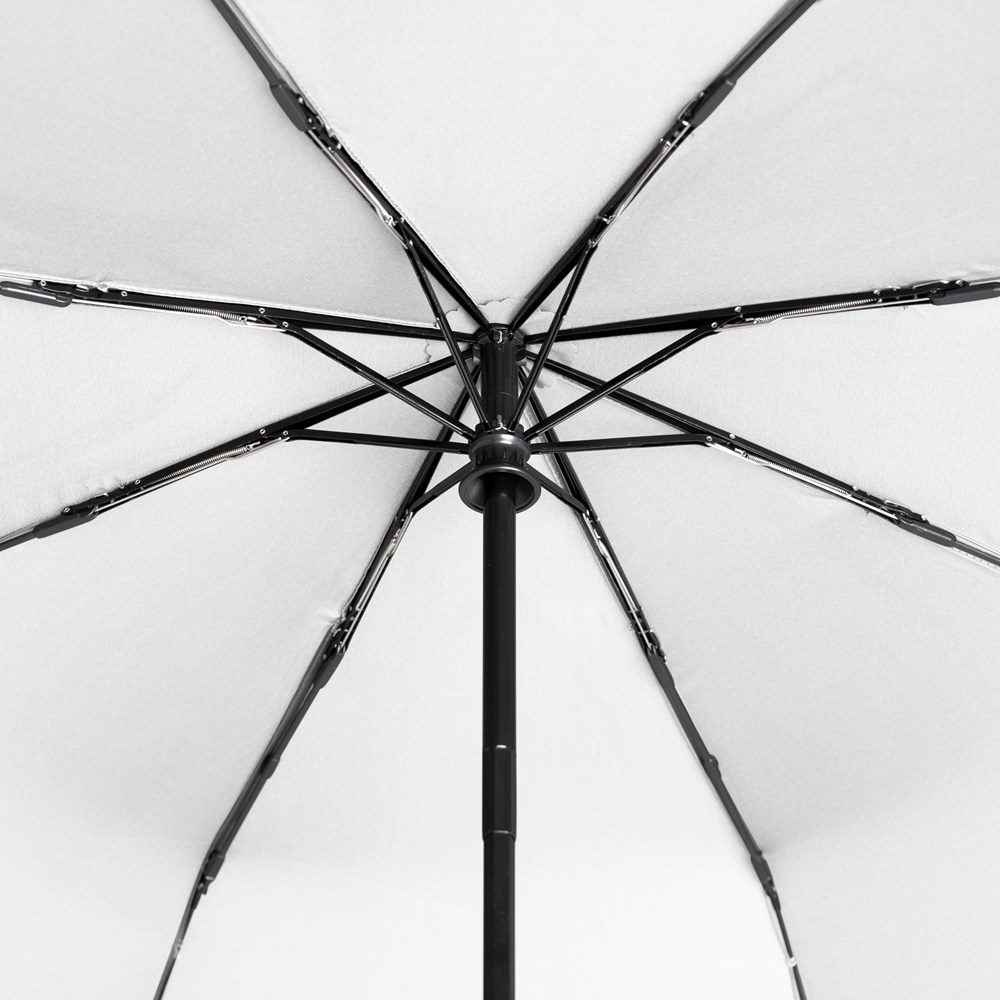Material: Polyester Pongee, Stahlstock, Fiberglas/Alu-Teilschienen, mattschwarzer Kunststoffgriff mit integrierter Auslösetaste, mattschwarzer Kunststoffgriff mit integrierter Drucktaste