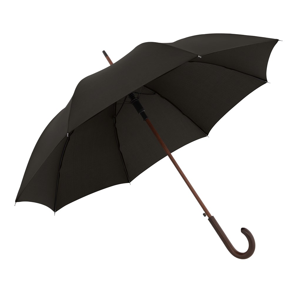 Zeitloser, klassischer Langschirm mit edlem Holzstock und flexiblen Fiberglaselementen für hohe Stabilität. Der elegante Rundhakengriff aus Holz liegt angenehm in der Hand und verleiht dem Schirm eine stilvolle Optik.