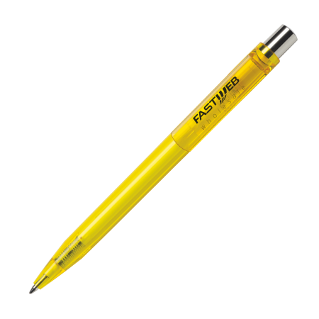 Das Gehäuse, das Drücker-Element und der Clip sind in 14 transparenten Farben lieferbar, die bereits ab 2.000 Stück untereinander kombinierbar sind. Der Drücker ist aus glänzendem Metall gefertigt. Der Kugelschreiber ist mit einer blauschreibenden Großraummine ausgestattet.
