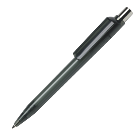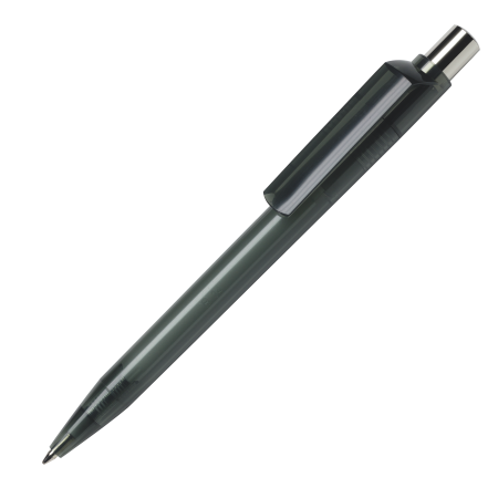 Das Gehäuse, das Drücker-Element und der Clip sind in 14 transparenten Farben lieferbar, die bereits ab 2.000 Stück untereinander kombinierbar sind. Der Drücker ist aus glänzendem Metall gefertigt. Der Kugelschreiber ist mit einer blauschreibenden Großraummine ausgestattet.