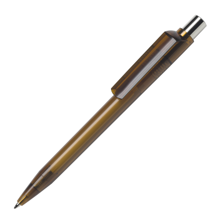 Das Gehäuse, das Drücker-Element und der Clip sind in 14 transparenten Farben lieferbar, die bereits ab 2.000 Stück untereinander kombinierbar sind. Der Drücker ist aus glänzendem Metall gefertigt. Der Kugelschreiber ist mit einer blauschreibenden Großraummine ausgestattet.