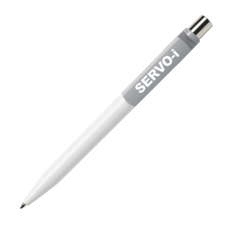 Das Gehäuse des Kugelschreibers ist aus hochglänzendem, solidem, weißem ABS gefertigt, der Drücker aus hochglänzendem Metall. Drücker-Element und Clip sind in 20 Farben lieferbar, die bereits ab 2.000 Stück untereinander kombinierbar sind. Er ist mit einer blauschreibenden Großraummine ausgestattet.