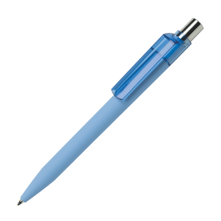 Das gummierte Gehäuse, das Drücker-Element und der transparente Clip sind in 15 Farben lieferbar; bereits ab 2.000 Stück können alle Teile des Kugelschreibers in den unterschiedlichen Farben kombiniert werden. Der Drücker ist aus glänzendem Metall gefertigt. Er ist mit einer blauschreibenden Großraummine ausgestattet. Dieser Kugelschreiber kann ausschließlich auf dem Clip bedruckt werden!