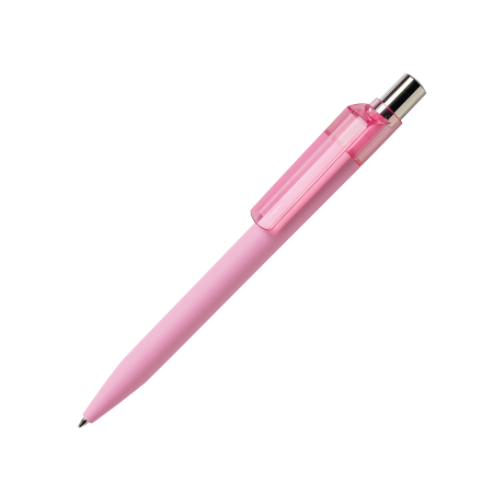 Das gummierte Gehäuse, das Drücker-Element und der transparente Clip sind in 15 Farben lieferbar; bereits ab 2.000 Stück können alle Teile des Kugelschreibers in den unterschiedlichen Farben kombiniert werden. Der Drücker ist aus glänzendem Metall gefertigt. Er ist mit einer blauschreibenden Großraummine ausgestattet. Dieser Kugelschreiber kann ausschließlich auf dem Clip bedruckt werden!
