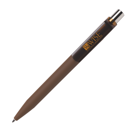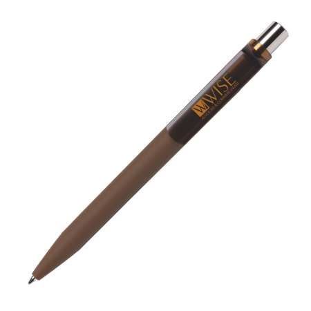 Das gummierte Gehäuse, das Drücker-Element und der transparente Clip sind in 15 Farben lieferbar; bereits ab 2.000 Stück können alle Teile des Kugelschreibers in den unterschiedlichen Farben kombiniert werden. Der Drücker ist aus glänzendem Metall gefertigt. Er ist mit einer blauschreibenden Großraummine ausgestattet. Dieser Kugelschreiber kann ausschließlich auf dem Clip bedruckt werden!