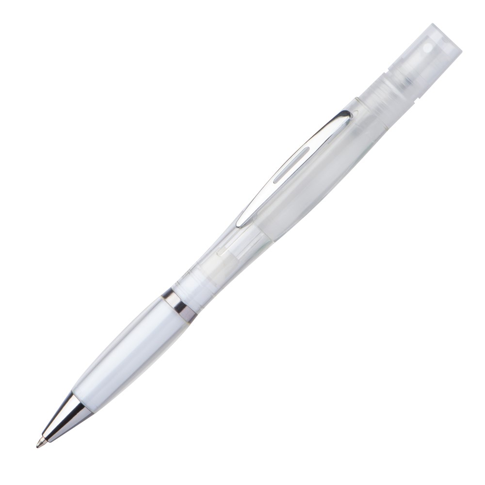 Der transparente Drehkugelschreiber mit silbernen Applikationen ist ein vielseitiges und praktisches Schreibgerät, das mehr kann als nur schreiben. Dieser Kugelschreiber verfügt über eine blau schreibende Mine, eine integrierte Kammer für Desinfektionsmittel mit Zerstäuber und ist nachfüllbar. Bitte beachten Sie, dass der Kugelschreiber ohne Desinfektionsmittel geliefert wird. Um Ihre Marke hervorzuheben, wird Ihr Logo rechts vom Clip auf dem Kugelschreiber gedruckt.