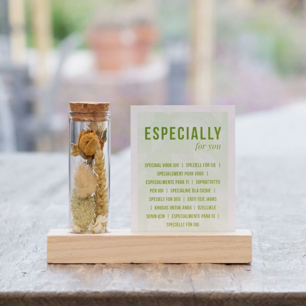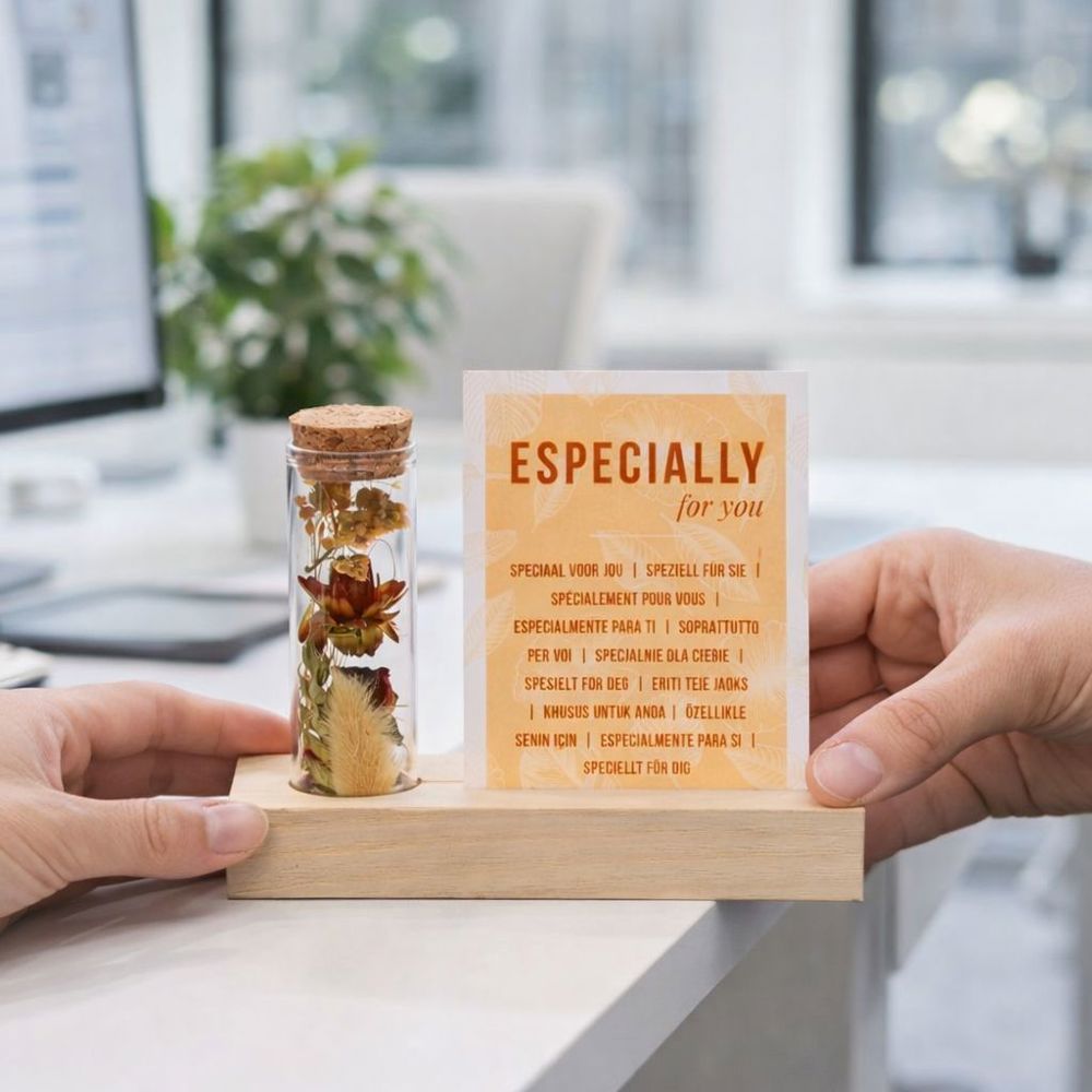 Diese stilvolle Trockenblumen-Variante besteht aus einem einzelnen Glasröhrchen, gefüllt mit farbenfrohen Trockenblumen, präsentiert auf einem Holzsockel mit Schlitz für eine lose A7-Karte. Sowohl die Karte als auch der Holzblock können mit einem Logo, Slogan oder einer Botschaft in Ihrer Unternehmensfarbe personalisiert werden. Bei diesem Artikel ist die A7-Karte wie auf dem Foto standardmäßig enthalten. Möchtest du stattdessen eine eigene, personalisierte Karte in Vollfarbe hinzufügen? Wähle dann die Personalisierungsoption – du zahlst nur die Einrichtkosten für den Druck.
