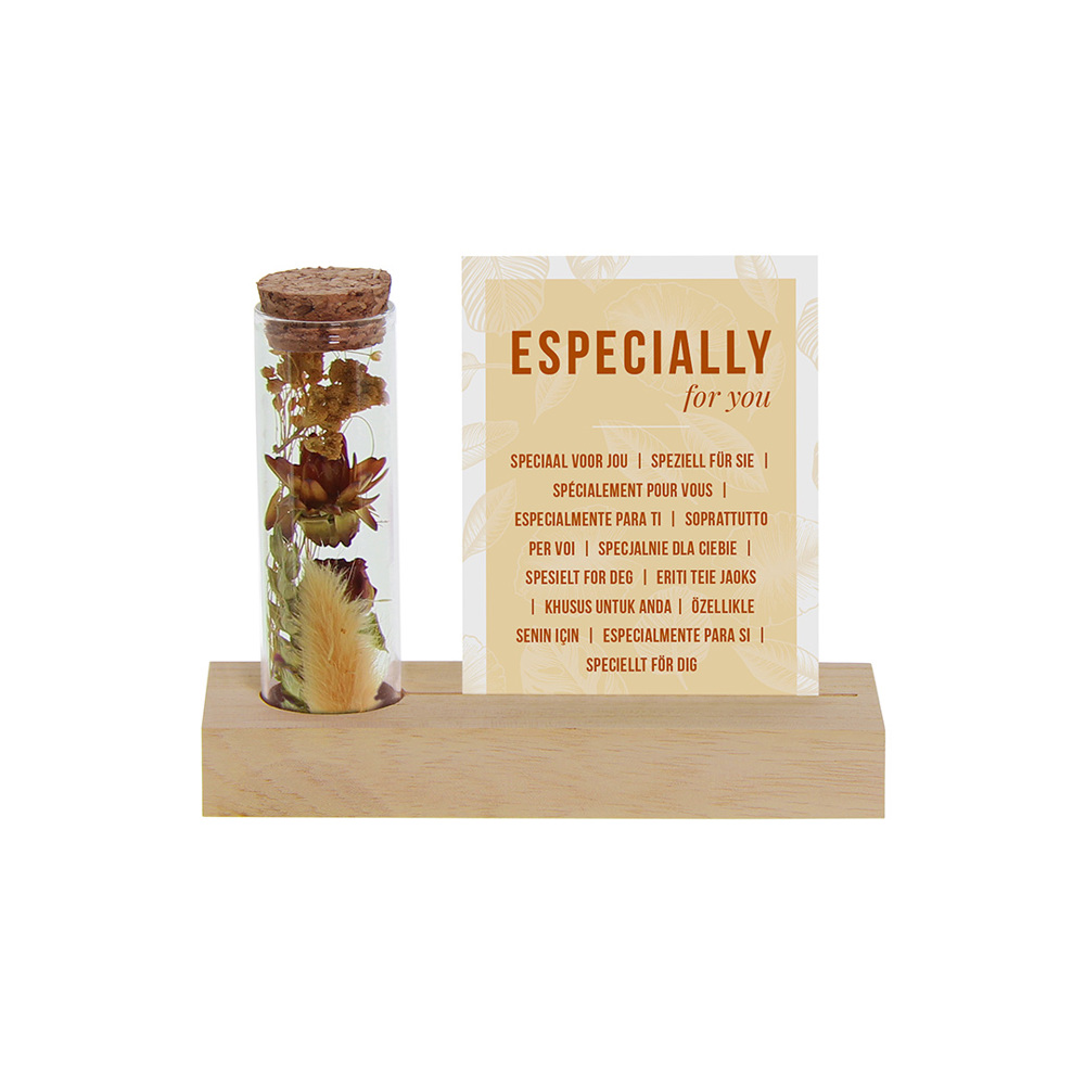 Diese stilvolle Trockenblumen-Variante besteht aus einem einzelnen Glasröhrchen, gefüllt mit farbenfrohen Trockenblumen, präsentiert auf einem Holzsockel mit Schlitz für eine lose A7-Karte. Sowohl die Karte als auch der Holzblock können mit einem Logo, Slogan oder einer Botschaft in Ihrer Unternehmensfarbe personalisiert werden. Bei diesem Artikel ist die A7-Karte wie auf dem Foto standardmäßig enthalten. Möchtest du stattdessen eine eigene, personalisierte Karte in Vollfarbe hinzufügen? Wähle dann die Personalisierungsoption – du zahlst nur die Einrichtkosten für den Druck.