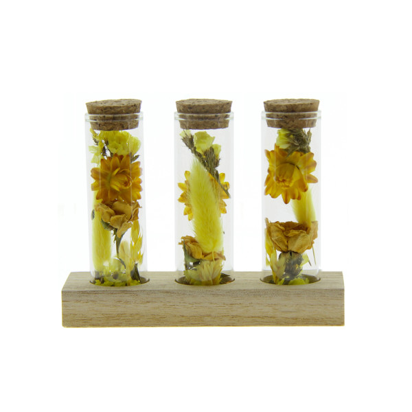 Diese hochwertige Variante enthält drei Glasröhrchen, gefüllt mit sorgfältig ausgewählten Trockenblumen, arrangiert auf einem Holzsockel. Sowohl die Blütenfarben als auch das Holz können an Ihre Markenfarben angepasst werden. Der Sockel bietet Platz für ein Logo oder eine kurze Botschaft.