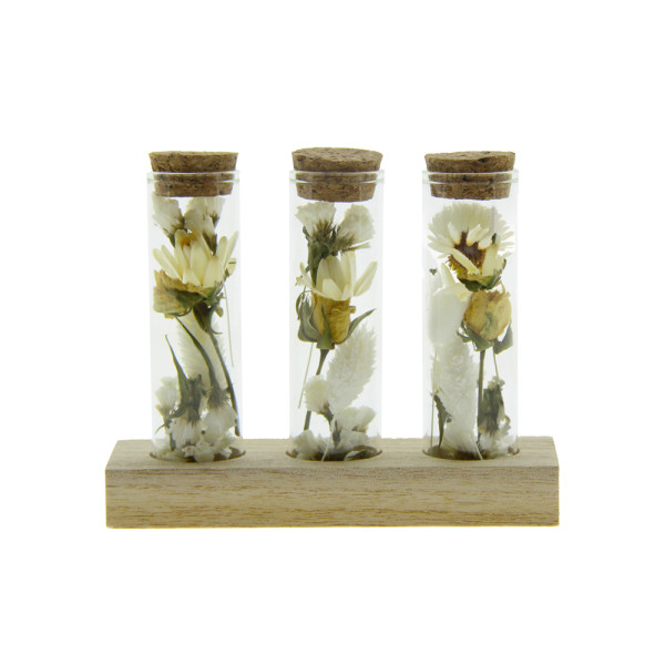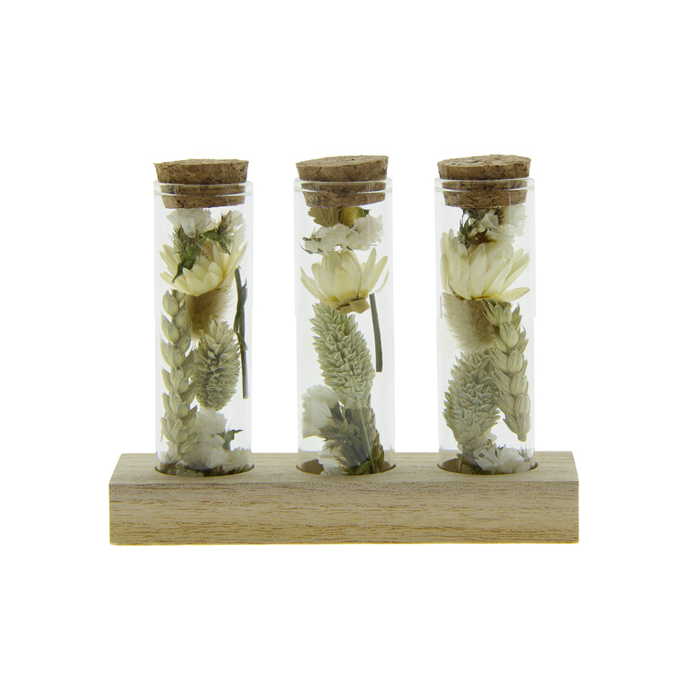 Diese hochwertige Variante enthält drei Glasröhrchen, gefüllt mit sorgfältig ausgewählten Trockenblumen, arrangiert auf einem Holzsockel. Sowohl die Blütenfarben als auch das Holz können an Ihre Markenfarben angepasst werden. Der Sockel bietet Platz für ein Logo oder eine kurze Botschaft.