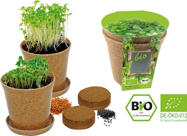 Ein Giveaway Natur pur. Der aus organischem Material hergestellte Topf kann später direkt in die Erde gesetzt werden und verrottet dort komplett nach einigen Monaten. Mit den Bio-Samen Basilikum und Kresse ist es ein ideales natürliches Werbepräsent. Die Banderole kann mit Ihrem Eindruck versehen oder, ebenfalls ab 250 Stück, individuell gestaltet werden.