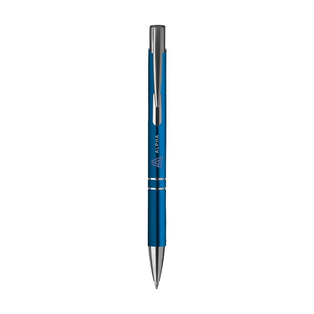 Blauschreibender oder schwarzschreibender Kugelschreiber aus Aluminium mit mattfarbenem Gehäuse in Metalloptik und metallenem Clip/Druckknopf.