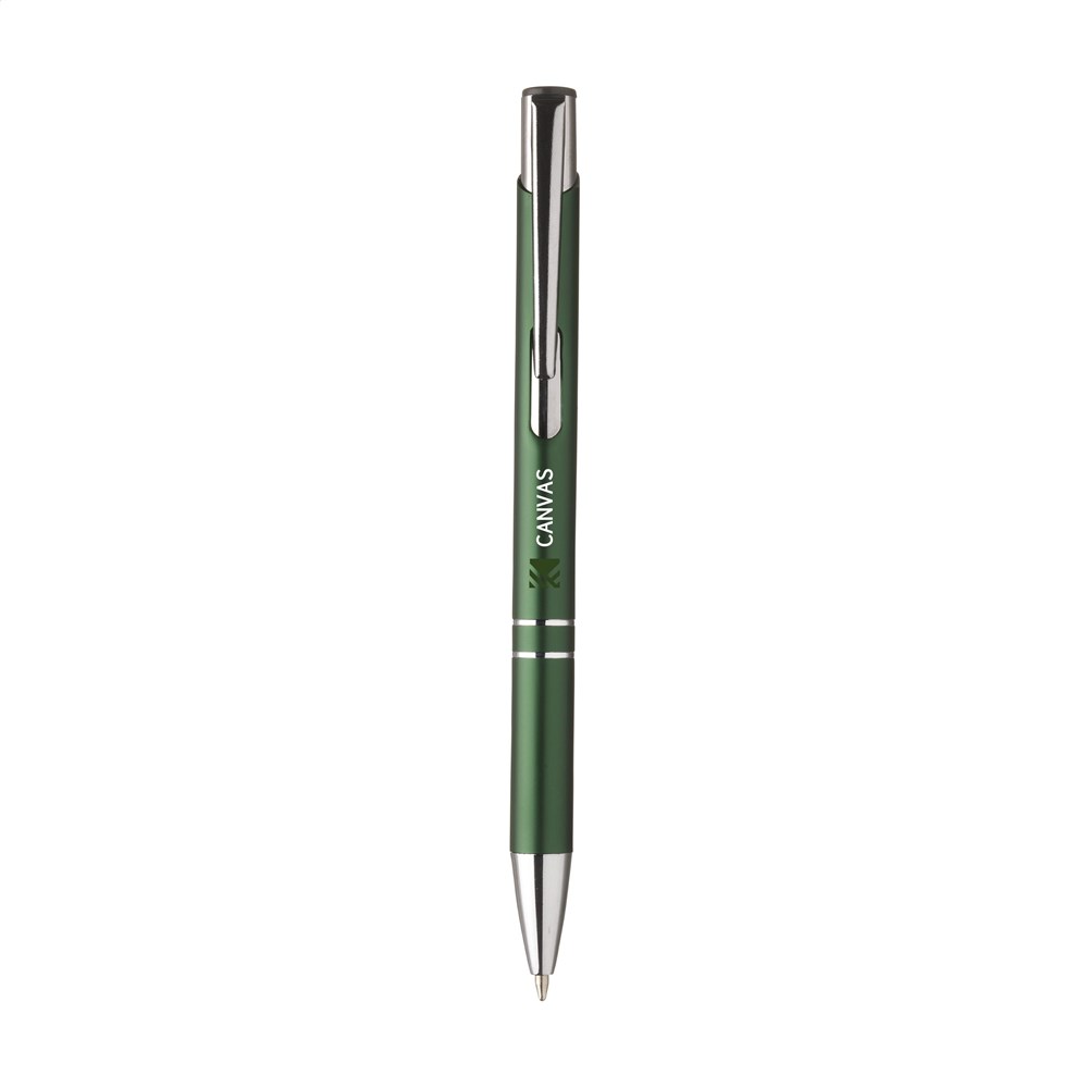Blauschreibender oder schwarzschreibender Kugelschreiber aus Aluminium mit mattfarbenem Gehäuse in Metalloptik und metallenem Clip/Druckknopf.