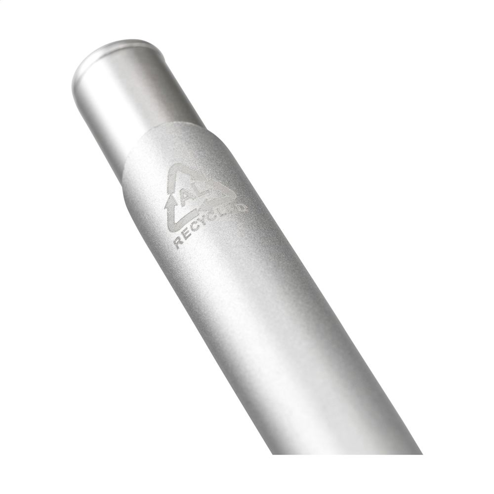Blau schreibender Kugelschreiber mit einem Gehäuse aus 100% recyceltem Aluminium. Mit Metallclip, Kunststoffspitze und Druckknopf. RCS-zertifiziert. Durch die Verwendung von recyceltem Aluminium werden bei der Herstellung dieses Produkts weniger neue Rohstoffe verwendet. Das bedeutet weniger Energieverbrauch und weniger Wasserverbrauch.