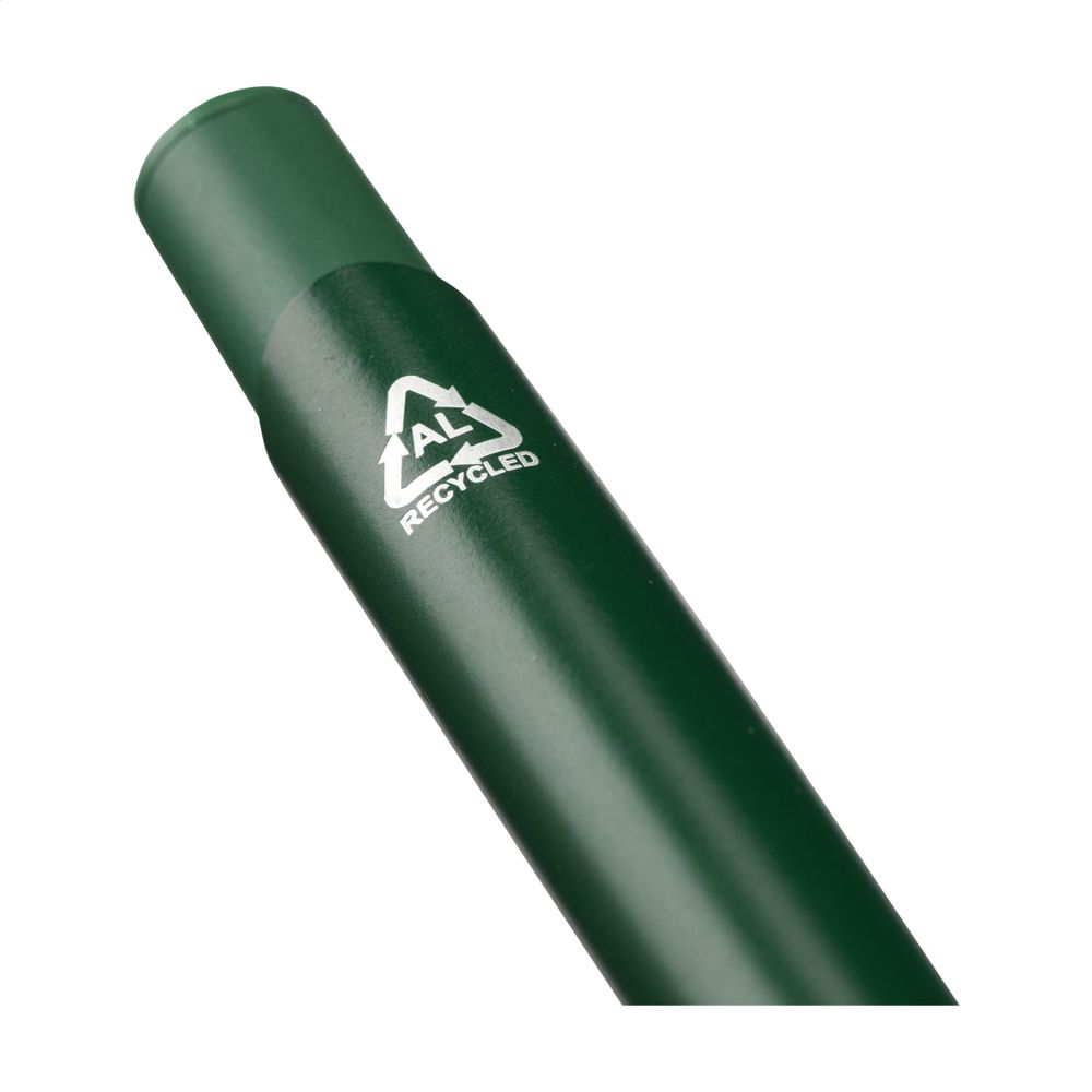 Blau schreibender Kugelschreiber mit einem Gehäuse aus 100% recyceltem Aluminium. Mit Metallclip, Kunststoffspitze und Druckknopf. RCS-zertifiziert. Durch die Verwendung von recyceltem Aluminium werden bei der Herstellung dieses Produkts weniger neue Rohstoffe verwendet. Das bedeutet weniger Energieverbrauch und weniger Wasserverbrauch.