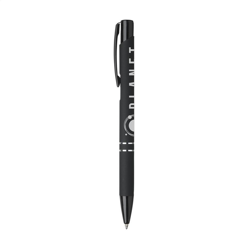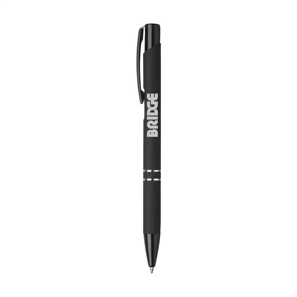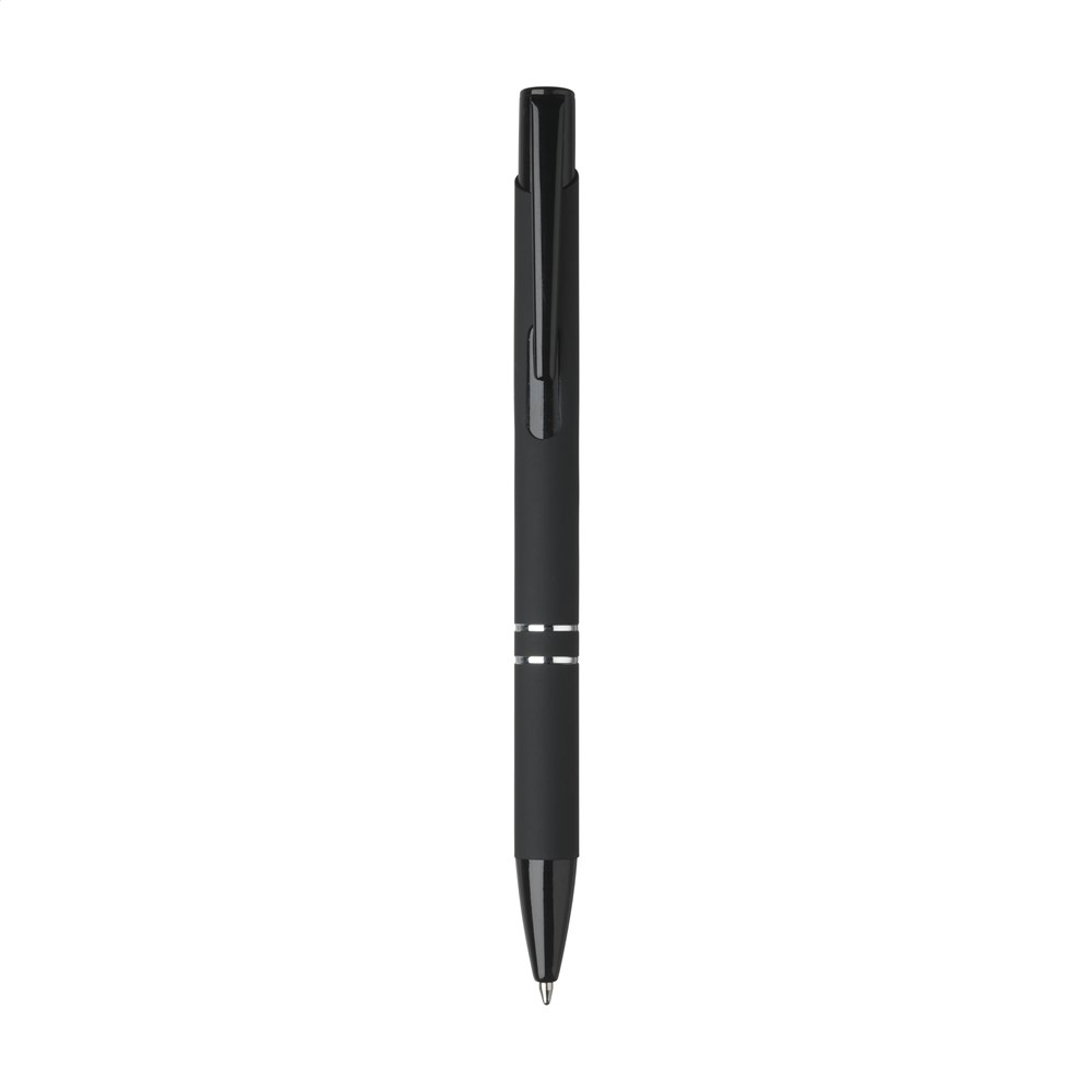 Blauschreibender Kugelschreiber mit schwarzem Druckknopf/Clip und Spitze, Chromverflechtungen. Das Gehäuse ist von einer Gummierung abgeschlossen.