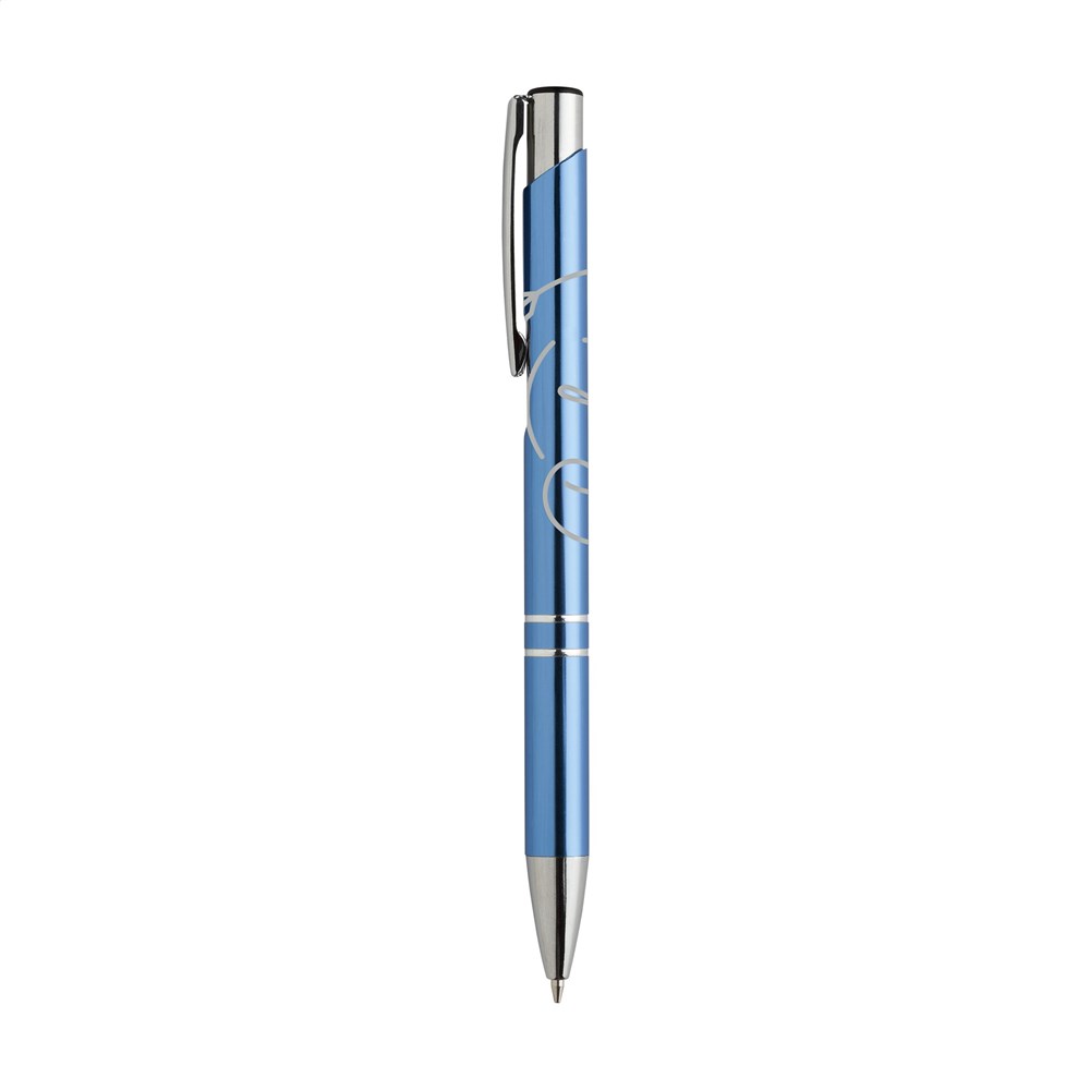 Blauschreibender Aluminiumkugelschreiber mit glänzendem Gehäuse in Metalloptik und metallenem Clip. mehr