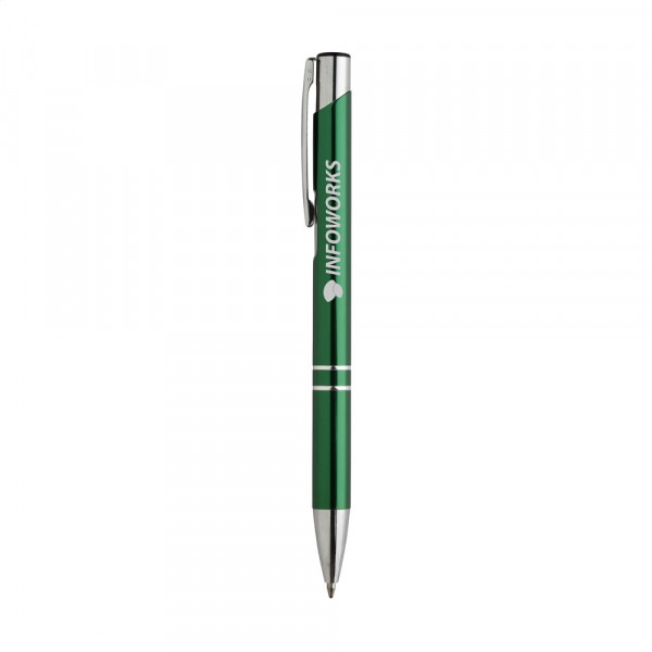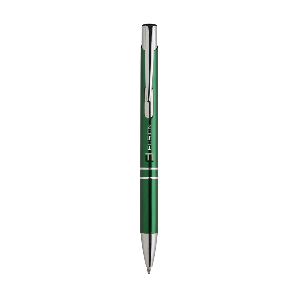 Blauschreibender Aluminiumkugelschreiber mit glänzendem Gehäuse in Metalloptik und metallenem Clip. mehr