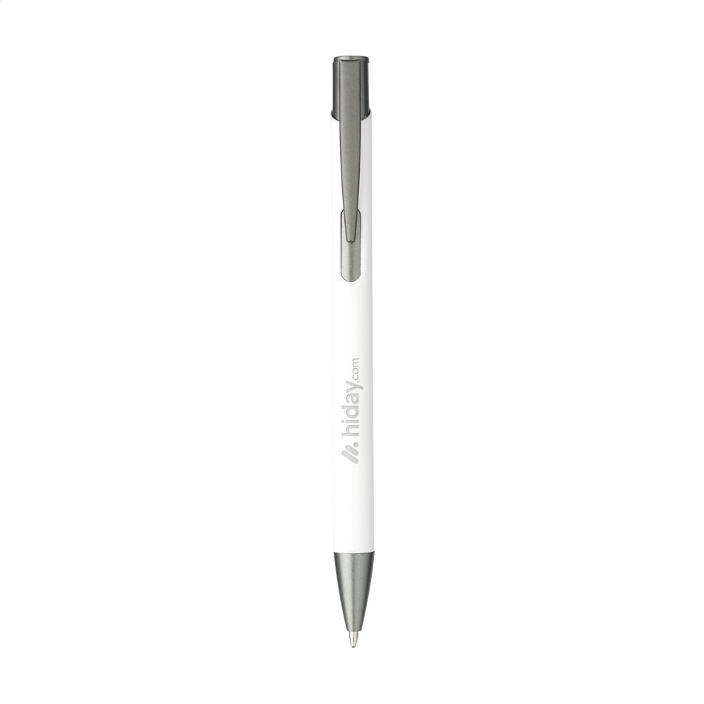 Blauschreibender Kugelschreiber mit einem Gehäuse aus recyceltem Aluminium. Das Gehäuse ist mit einer gummierten Soft-Touch-Oberfläche versehen. Mit Metallclip/Druckknopf. RCS-zertifiziert. Gesamtes recyceltes Material: 94%. Durch die Verwendung von recyceltem Aluminium werden bei der Herstellung dieses Produkts weniger neue Rohstoffe verwendet. Das bedeutet weniger Energieverbrauch und weniger Wasserverbrauch.