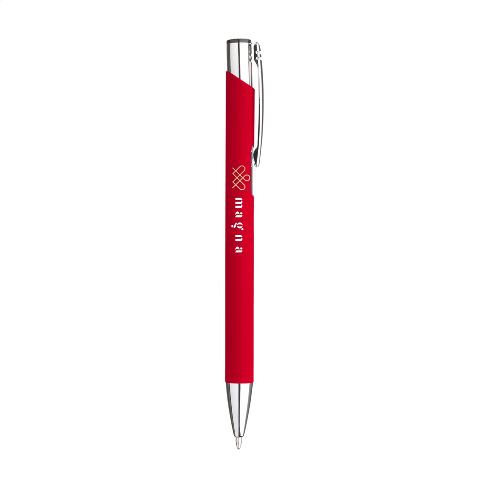 Blauschreibender Aluminium-Kugelschreiber mit Metallclip. Der Halter ist mit einer schönen gummierten Oberfläche versehen. Durch den einteiligen Halter bietet dieser Stift Platz für einen großen Aufdruck.