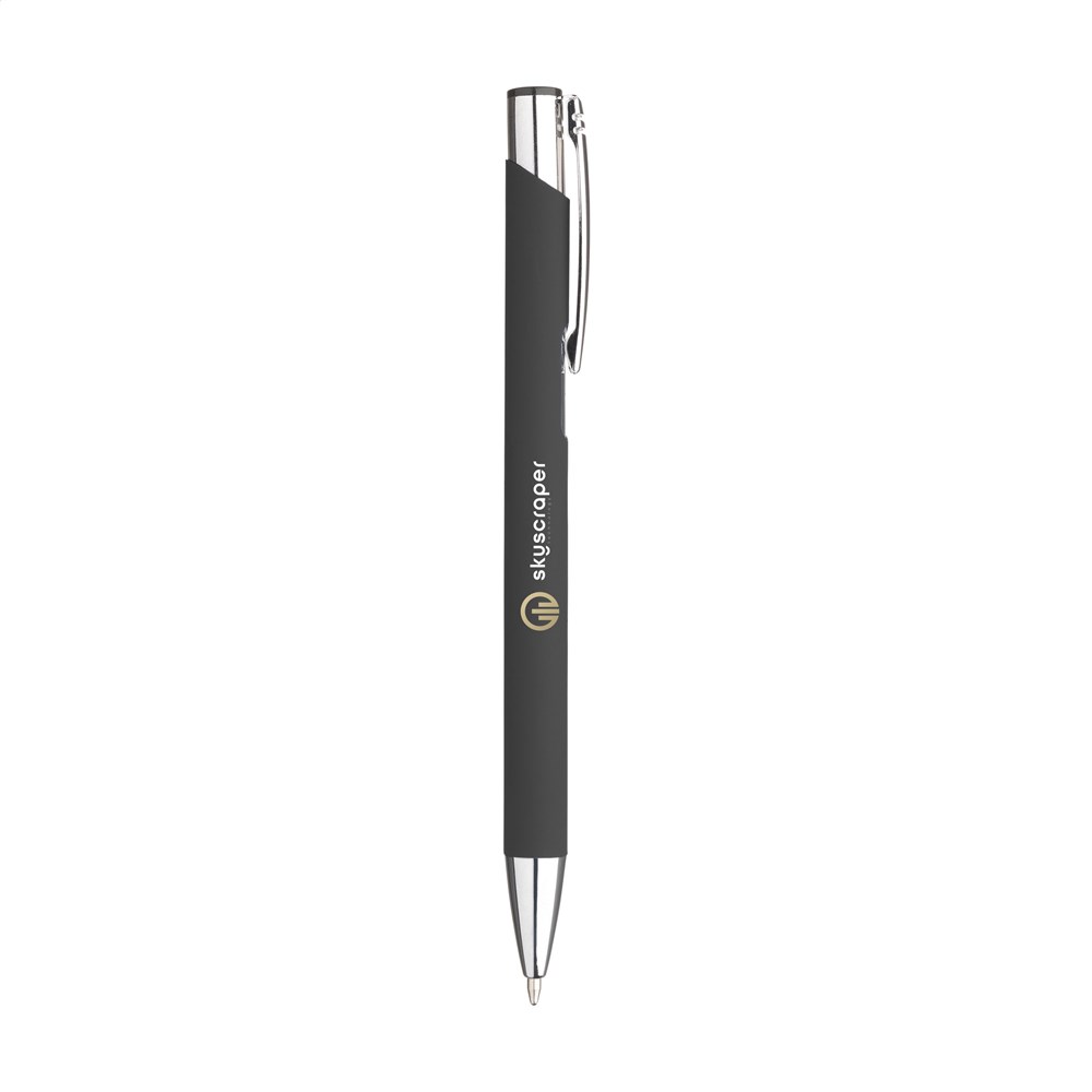 Blauschreibender Aluminium-Kugelschreiber mit Metallclip. Der Halter ist mit einer schönen gummierten Oberfläche versehen. Durch den einteiligen Halter bietet dieser Stift Platz für einen großen Aufdruck.