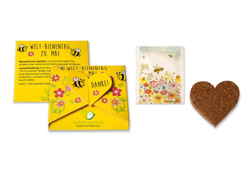 Das kleine, kreative Präsent wird Ihnen dabei helfen, die Herzen Ihrer KundInnen zu erobern. Die gefaltete Karte enthält eine Samentüte mit Blumensaat und ein Herz aus Kokosfasern als Anzuchtsubstrat und bietet viel Platz für Ihre Botschaften. *** INDIVIDUELLE GESTALTUNG DER KARTE MÖGLICH. Saatsorten im Standard-Innentütchen: Bunte Blumenwiese, Kornblume, Mohn, Sonnenblume, Vergissmeinnicht, Wildblumen, Margeriten, Klee, Bienenblumen, Tannenbaum (Rotfichte), Kresse, Basilikum, Rucola oder Petersilie (individuelle Saatanfragen möglich)