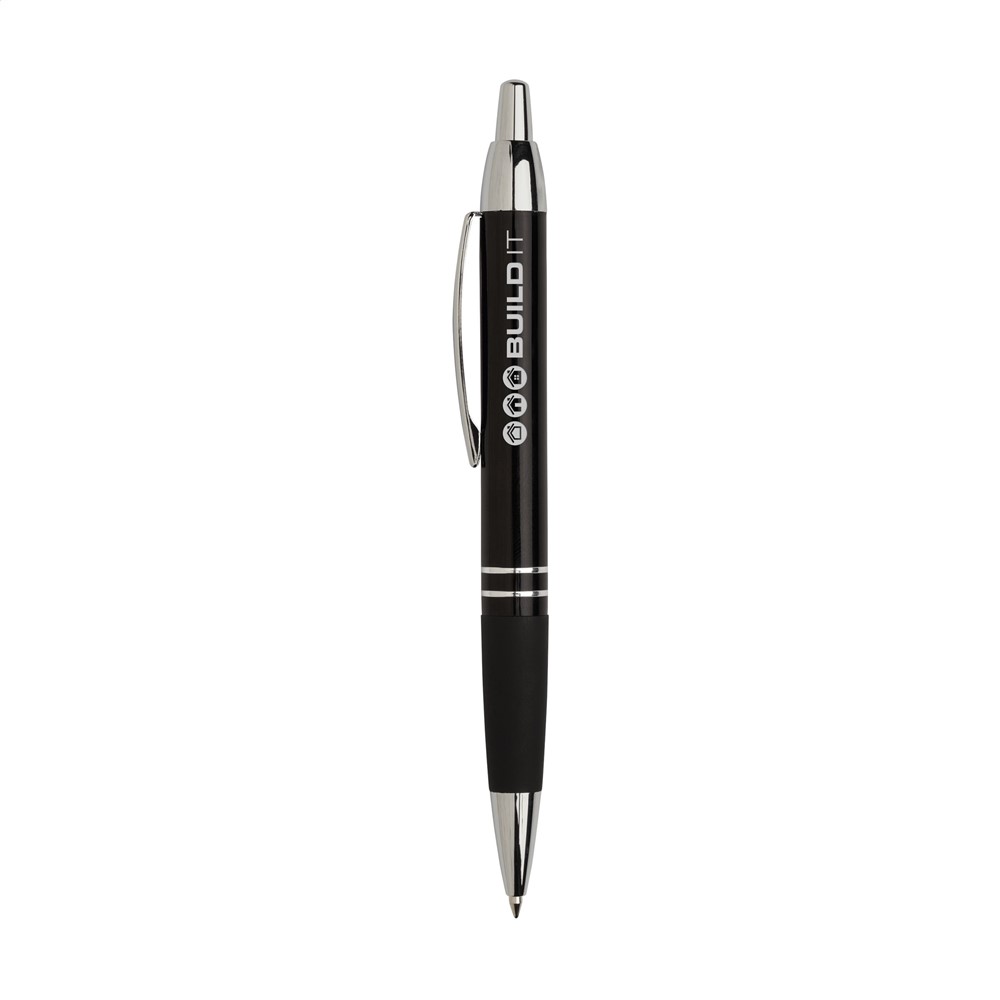 Blauschreibender, metallener Kugelschreiber mit hochglänzendem Gehäuse in Metalloptik, gummierte Grifffläche, fester Metallclip und Druckknopf und silberfarbene hochglänzende Akzente.